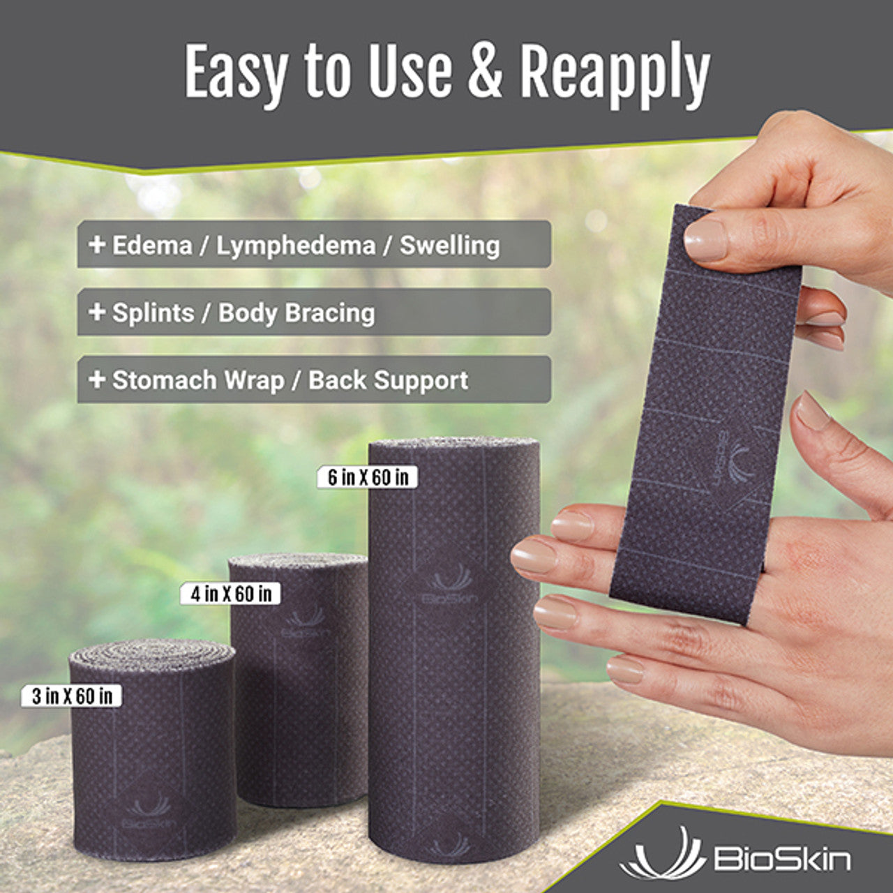 BioSkin Wrap is a versatile and powerful ally in injury support, offering tailored compression care. With self-adhering closure technology, it ensures a secure fit without the fuss of fasteners or adhesives, delivering continuous and reliable support that won’t loosen over time. BioSkin Wrap adheres only to itself, not to skin or clothing, and is strong, durable, and reusable for more than 100 washes.